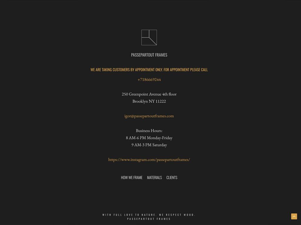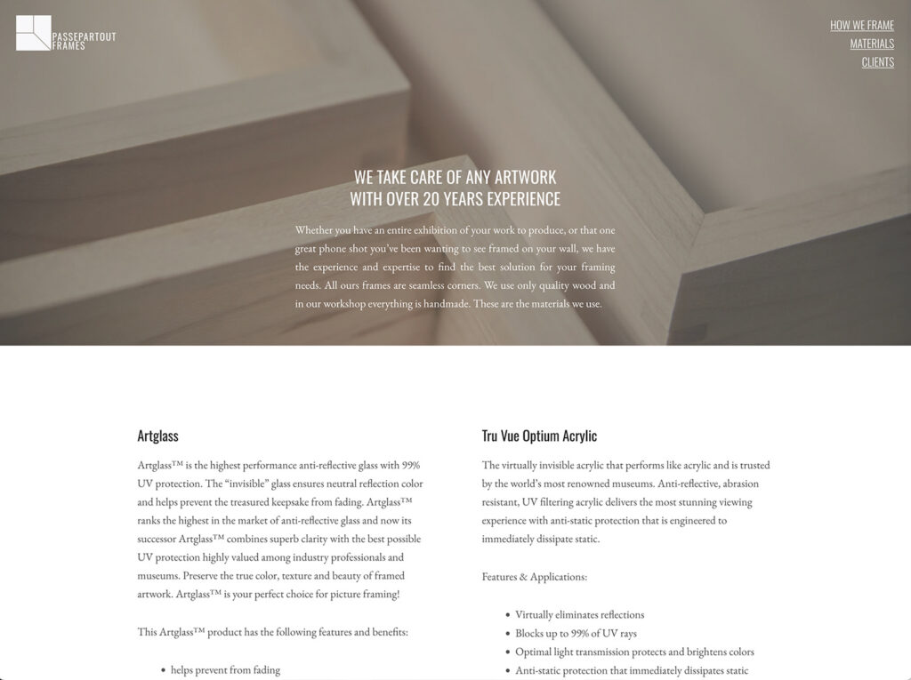 The website was built in WordPress without using pre-made themes. A fully custom design was implemented to reflect the unique craftsmanship of the handmade frames.